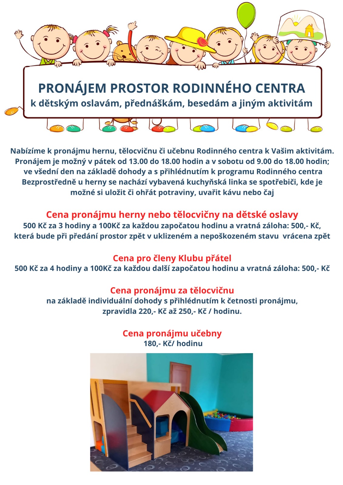 Nabízíme Vám možnost využít prostory herny a tělocvičny Rodinného centra Parníček k uspořádání oslavy pro Vaše nejmilejší ratolesti a jejich kamarády, a to jak o víkendu (kromě neděle) tak i v některý ze všedních dnů. Využijte rodinného prostředí našeho RC.