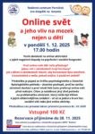 Zveme vás v pondělí 1.12.2025 od 17:00 hod. na besedu o online světě, vstupné je 100 kč. Prosím rezervace dopředu přes e-mail nebo telefonicky do 28.11.2025, děkujeme.