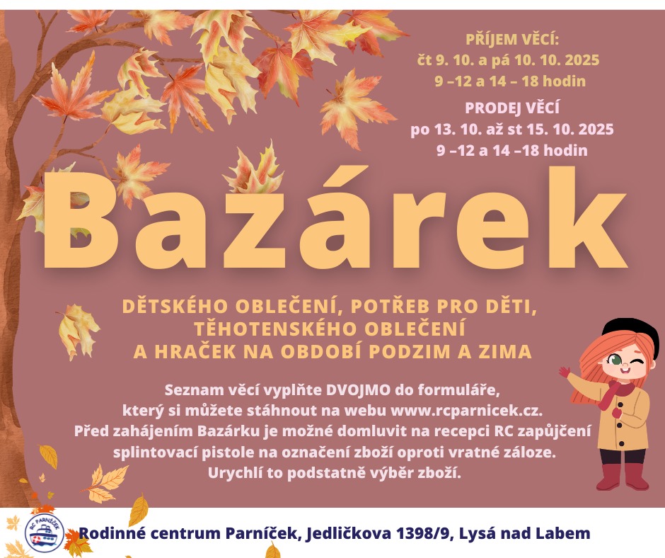 | Bazárky pořádané u nás jsou velice úspěšné. Během posledních 3 bazárků se prodaly věci v hodnotě 80.000 Kč až 100.000 Kč; všechny peníze dostali prodávající, kteří se rozhodli prostřednictvím našeho Rodinného centra Parníček prodat věci po svých dětech, hračky či těhotenské oblečení a potřeby pro děti. Za účast moc děkujeme a budeme se těšit na prodejce i nakupující! |